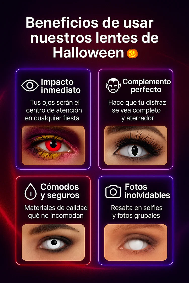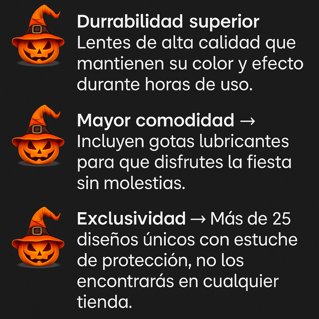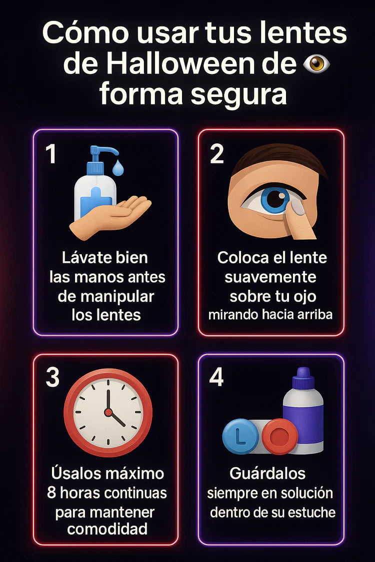 Están diseñados para usarse de manera temporal en fiestas, cosplay o Halloween. Puedes llevarlos durante varias horas seguidas sin molestias, siempre y cuando uses las gotas lubricantes cuando lo necesites.
