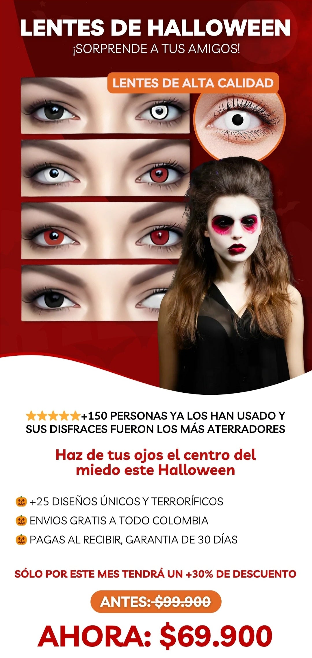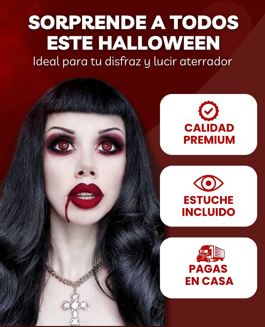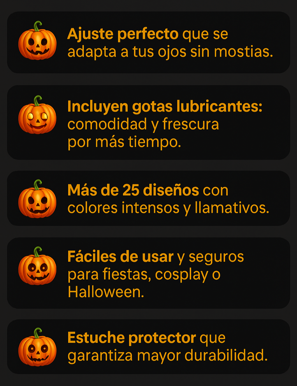 Están diseñados para usarse de manera temporal en fiestas, cosplay o Halloween. Puedes llevarlos durante varias horas seguidas sin molestias, siempre y cuando uses las gotas lubricantes cuando lo necesites.