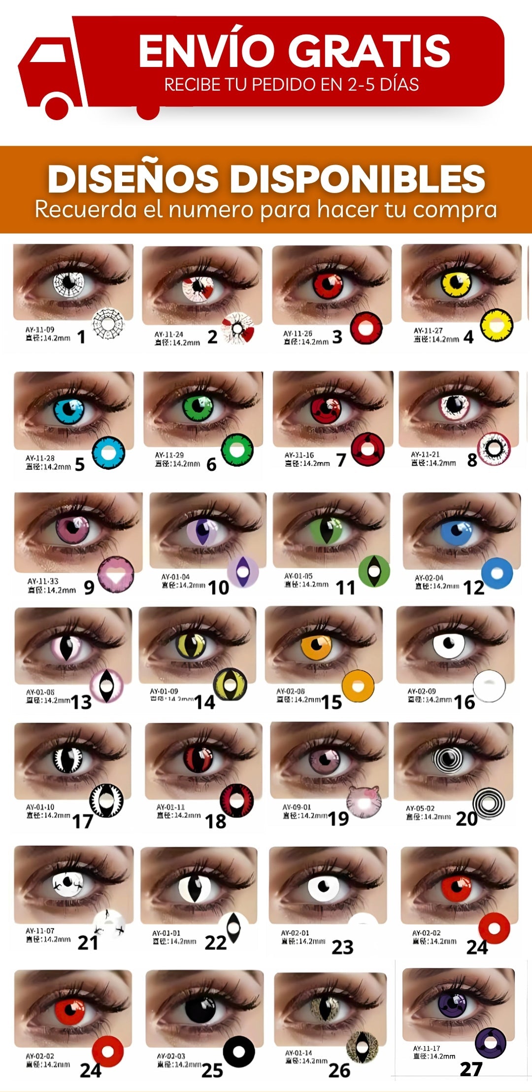 Cada par de lentes incluye su estuche protector y gotas lubricantes, además tienes acceso a más de 25 diseños exclusivos para elegir.